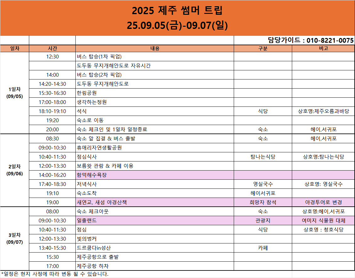 지난 회차 운영 경험을 바탕으로 더 즐거운 제주 여행이 되실 수 있도록 일부 스케줄이 변경되었습니다. 참고부탁드립니다.